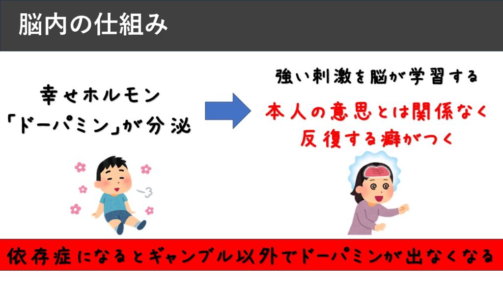 - ドーパミンの過剰放出: ギャンブルの刺激で大量のドーパミンが出ると、脳が麻痺し、普通の幸せ(食事や睡眠)では満足できなくなります。